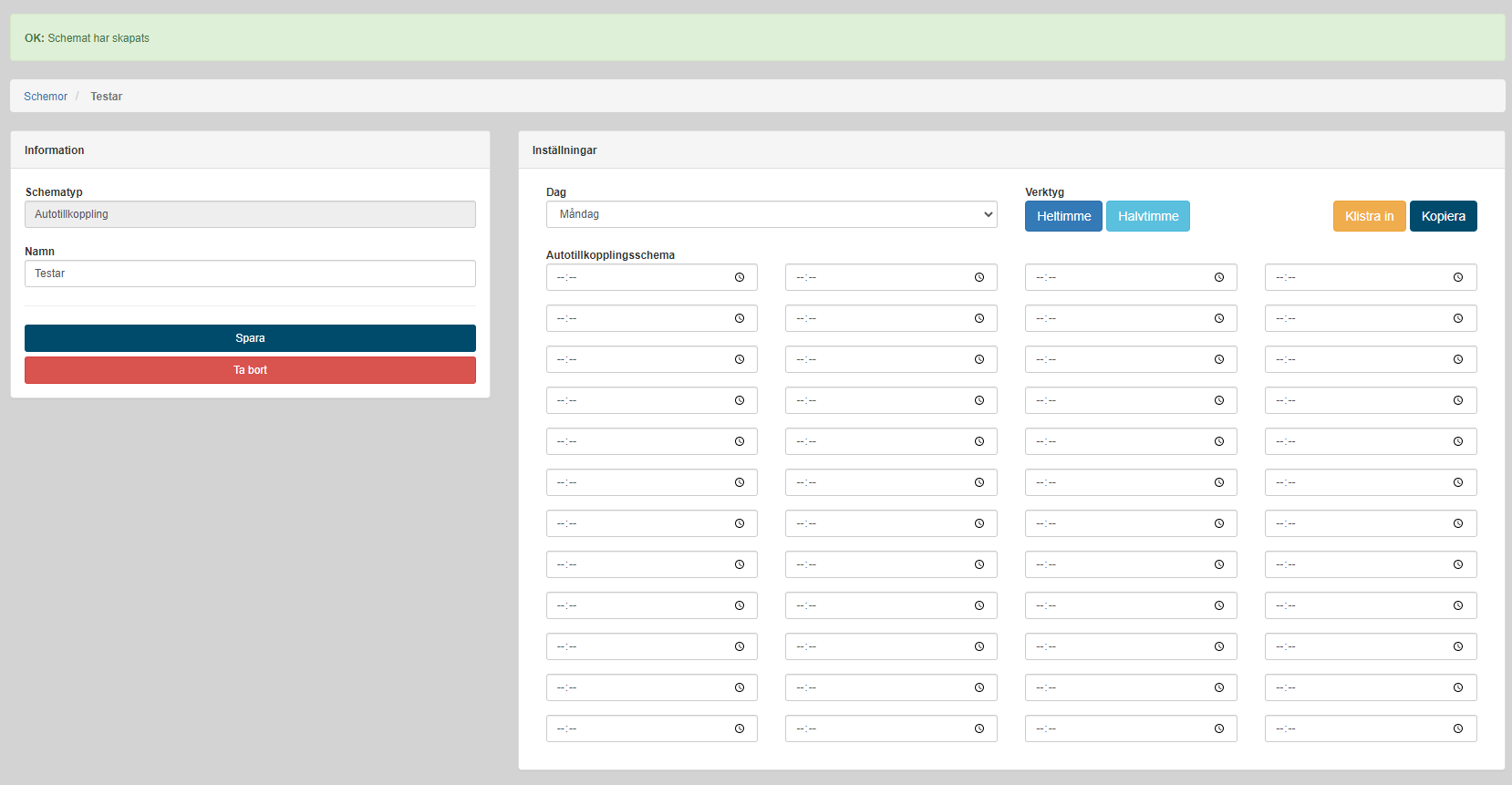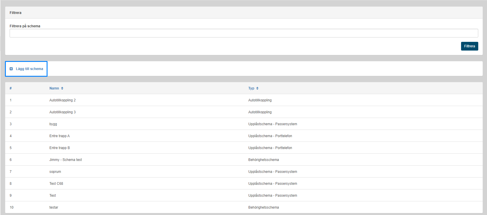 För att skapa ett schema navigera till "Hantera -> Schema" klicka på knappen Lägg till schema