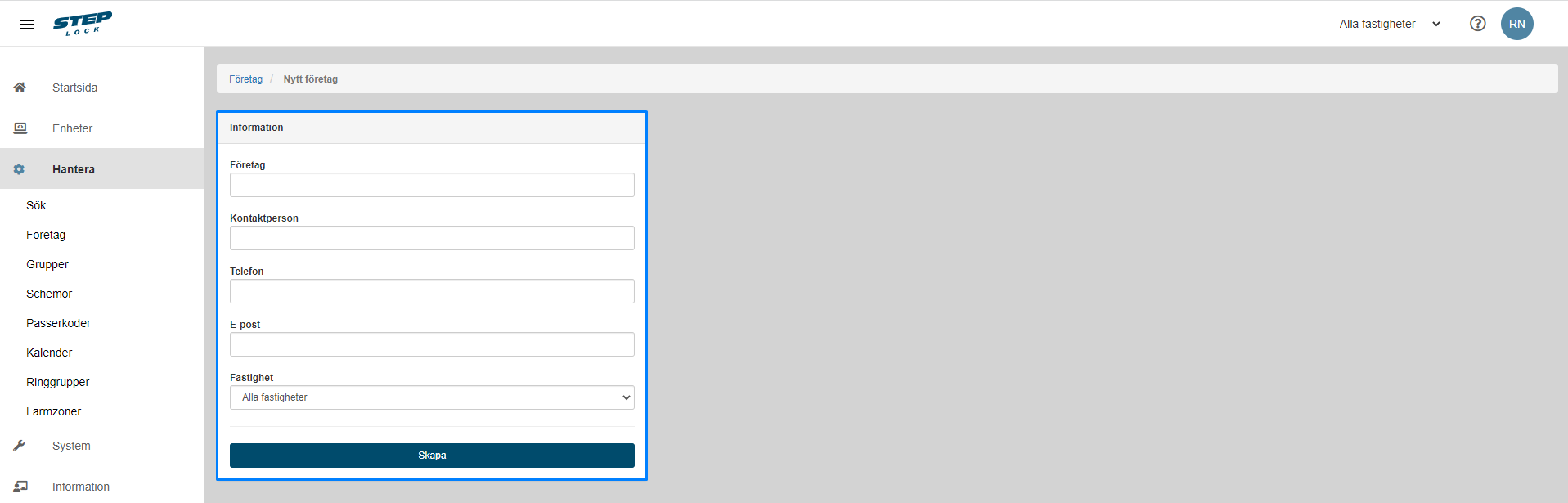 Ange Företagsnamn samt ev. kontaktinformation och klicka på Skapa.