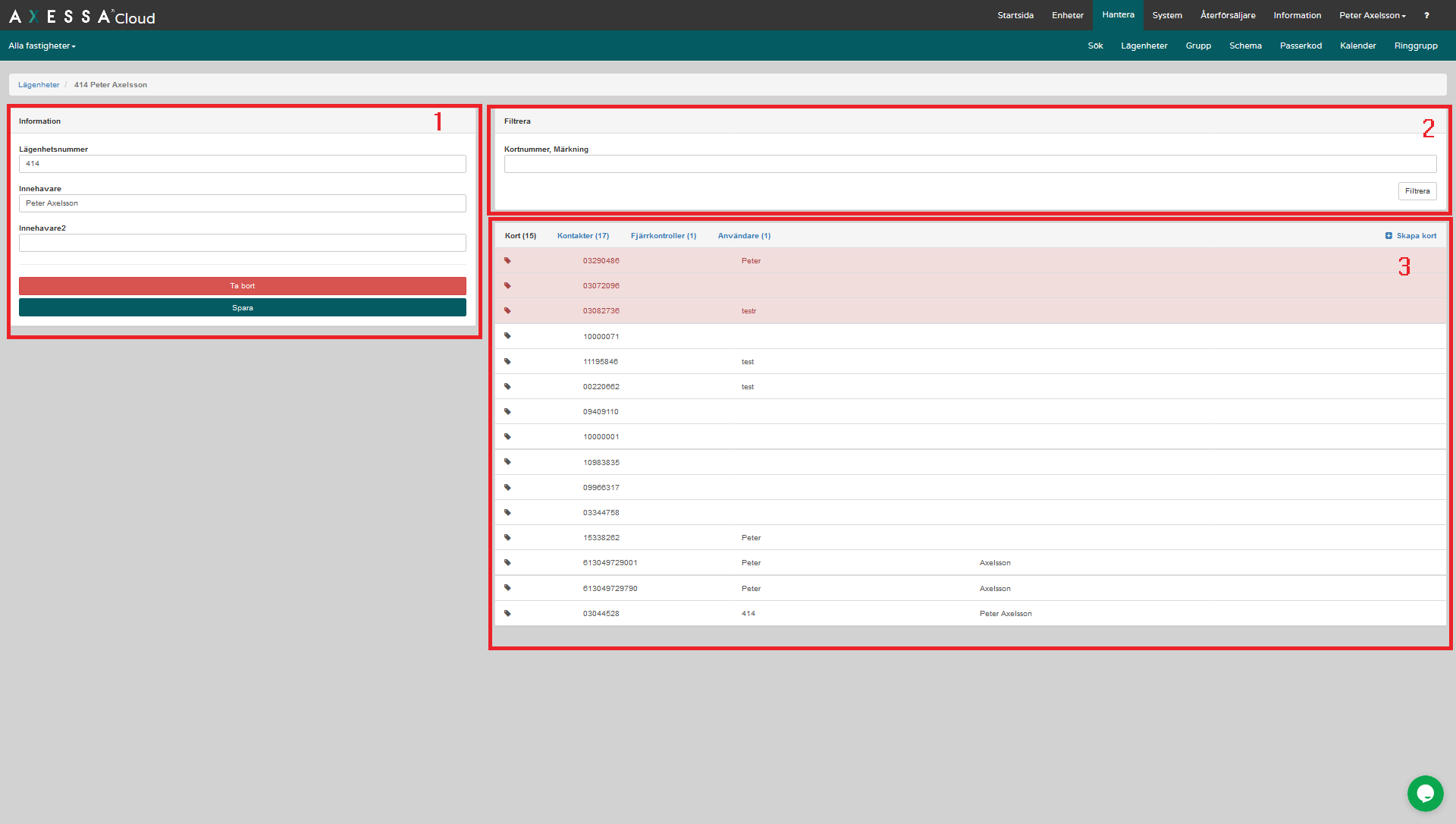 Kort, Kontakter i porttelefon, Fjärrkontroller, Portalanvändare, Enycklar.